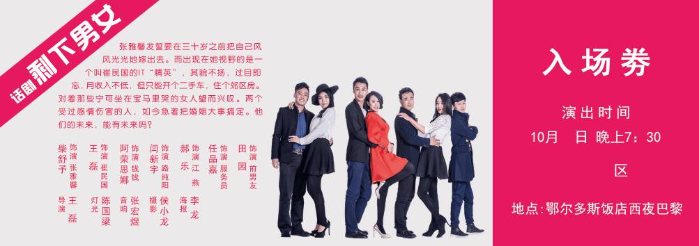 东胜区文化馆 继鄂尔多斯首部本土话剧《单身秘密》在东胜区2015年元宵文化节上精彩上演后,本土话剧受到无数话剧爱好者的热爱和追捧。10月17日、18,又一部自导自演的本土话剧《剩下男女》将再次来袭,带您一起感受现代都市剩男剩女的爱情故事。 剧情介绍:张雅馨发誓要在三十岁之前把自己风风光光地嫁出去。而出现在她视野的是一个叫崔民国的IT“精英”,其貌不扬,过目即忘,月收入不低,但只能开个二手车,住个郊区房。对着那些宁可坐在宝马里哭的女人望而兴叹。两个受过感情伤害的人,如今急着把婚姻大事搞定。他们的未来,能有未来吗? 主办单位:东胜区文化局 演出时间:10月17日、18日每晚七点半 演出地点:东胜区鄂尔多斯饭店西夜巴黎 (该话剧为公益演出,观看话剧需凭票入场,免费领票地点:东胜区文化馆505室 贾瑞英 0477-8361072)